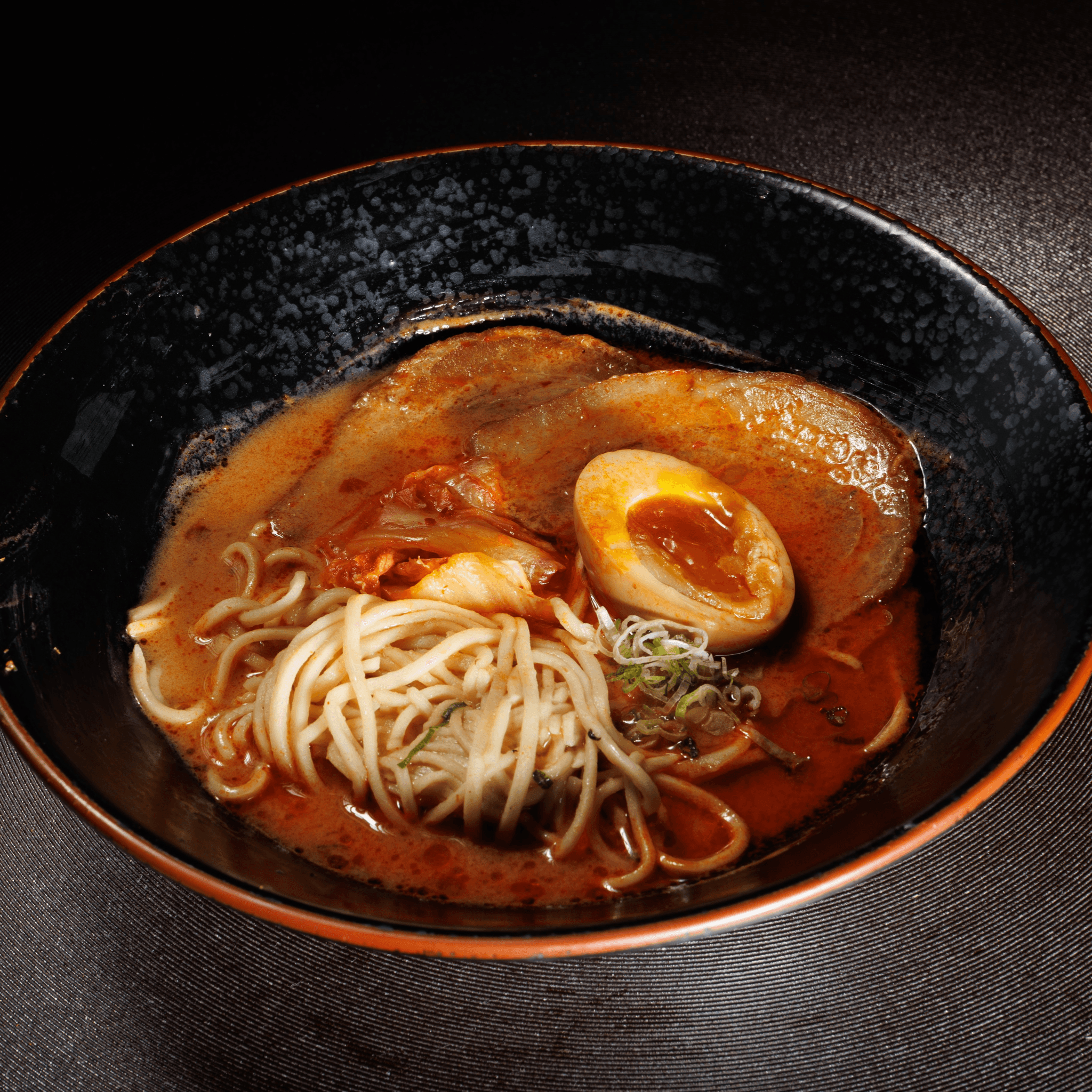 Pork bone based broth, red chili paste, braised pork belly, soft boiled egg, menma, Japanese wood ear mushroom, scallions, & black garlic oil