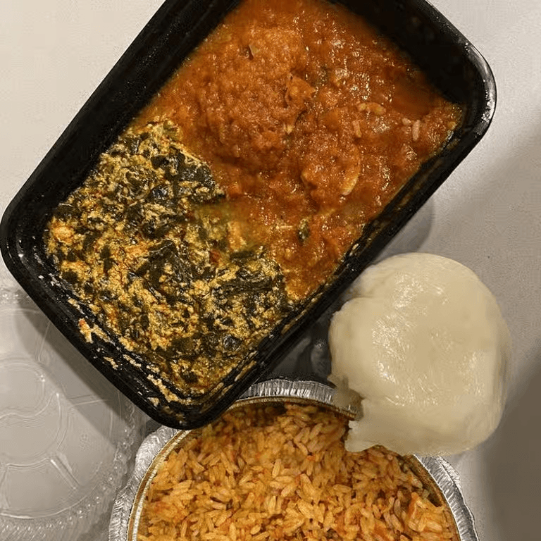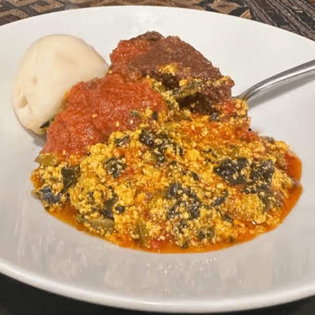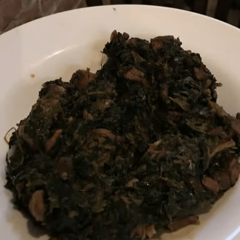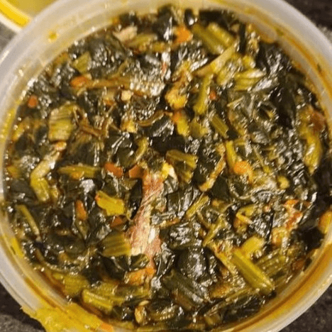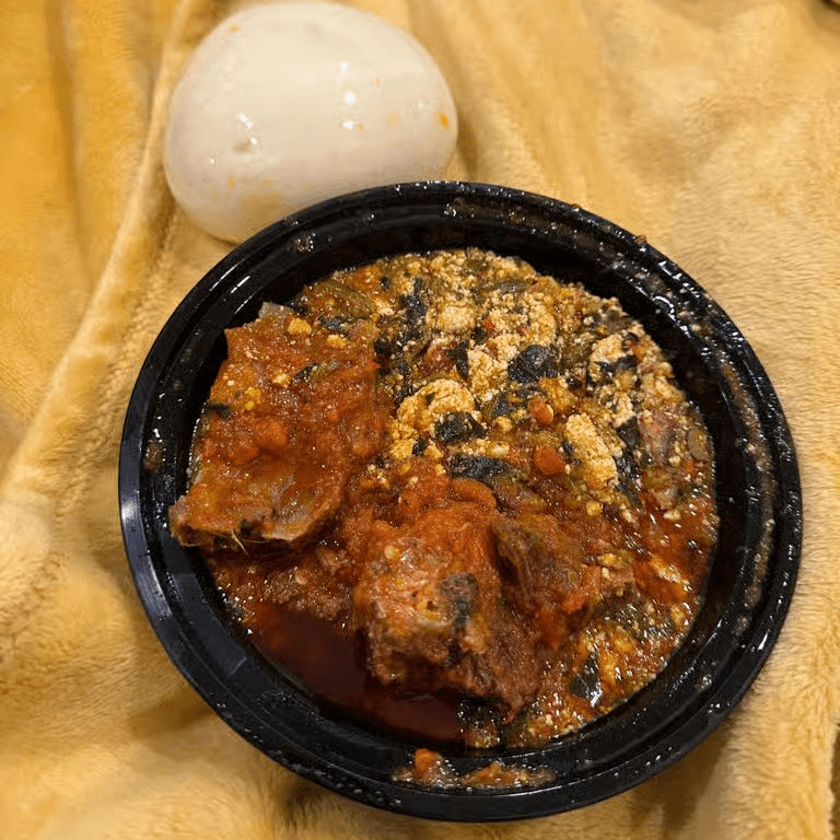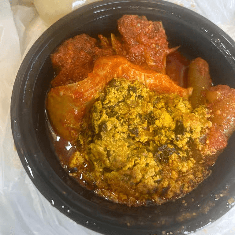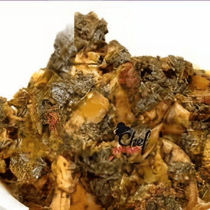 Goat cooked in a thick sauce made from bitter leaves, smoked fish and stock fish, served with fufu