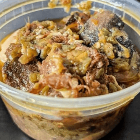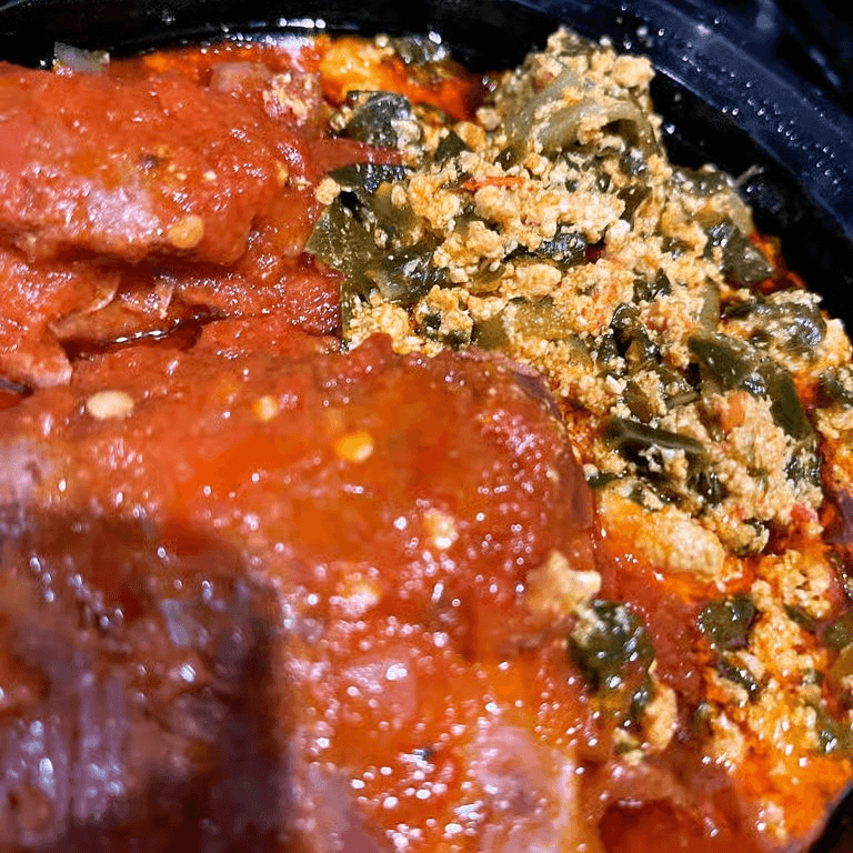 Ground ogbono pods cooked in a rich broth with red pepper and dried fish