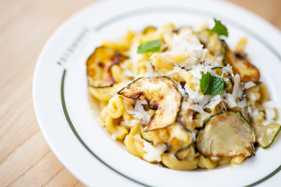 Peak season zucchini, pecorino di fossa, spring garlic, mint, lemon