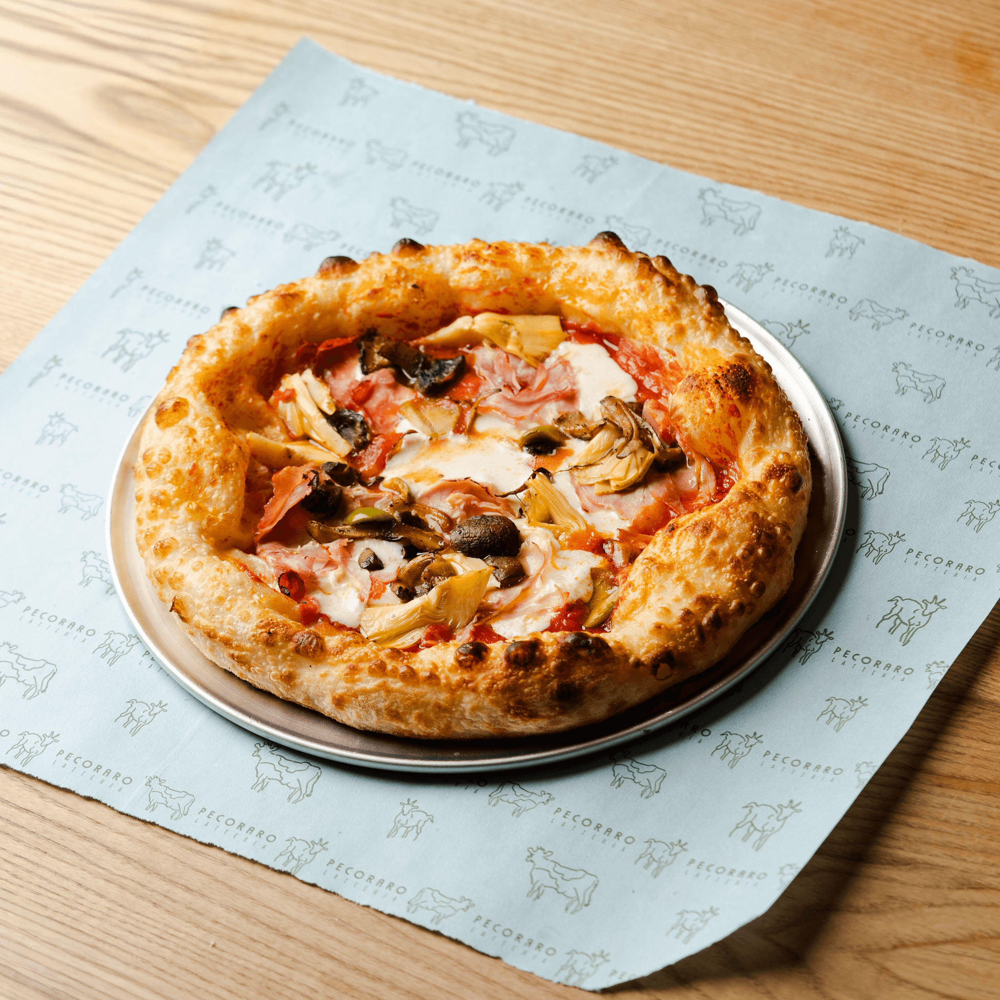 Tomato passata, parma cotto, artichoke, mushrooms, Sicilian olives