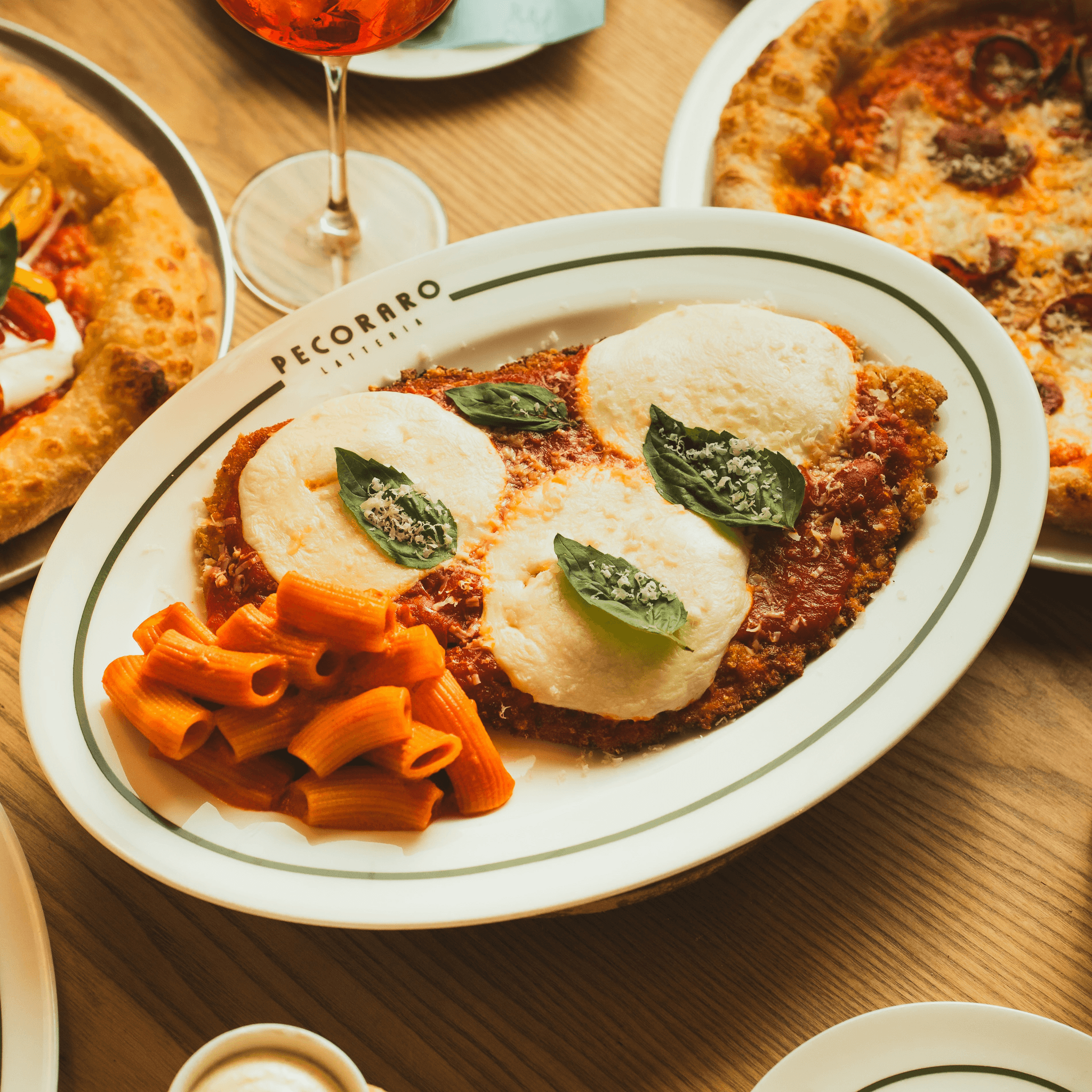 Our B&E breaded and fried cutlet, spicy vodka sauce, smoked mozzarella, n’duja, fresh basil