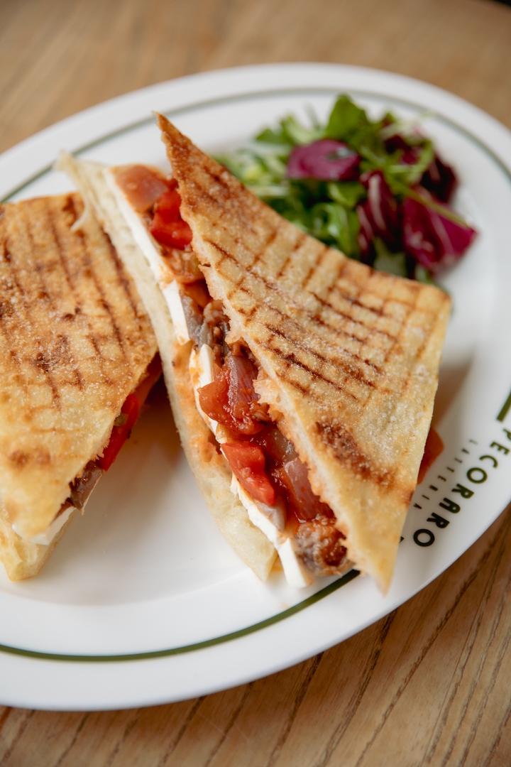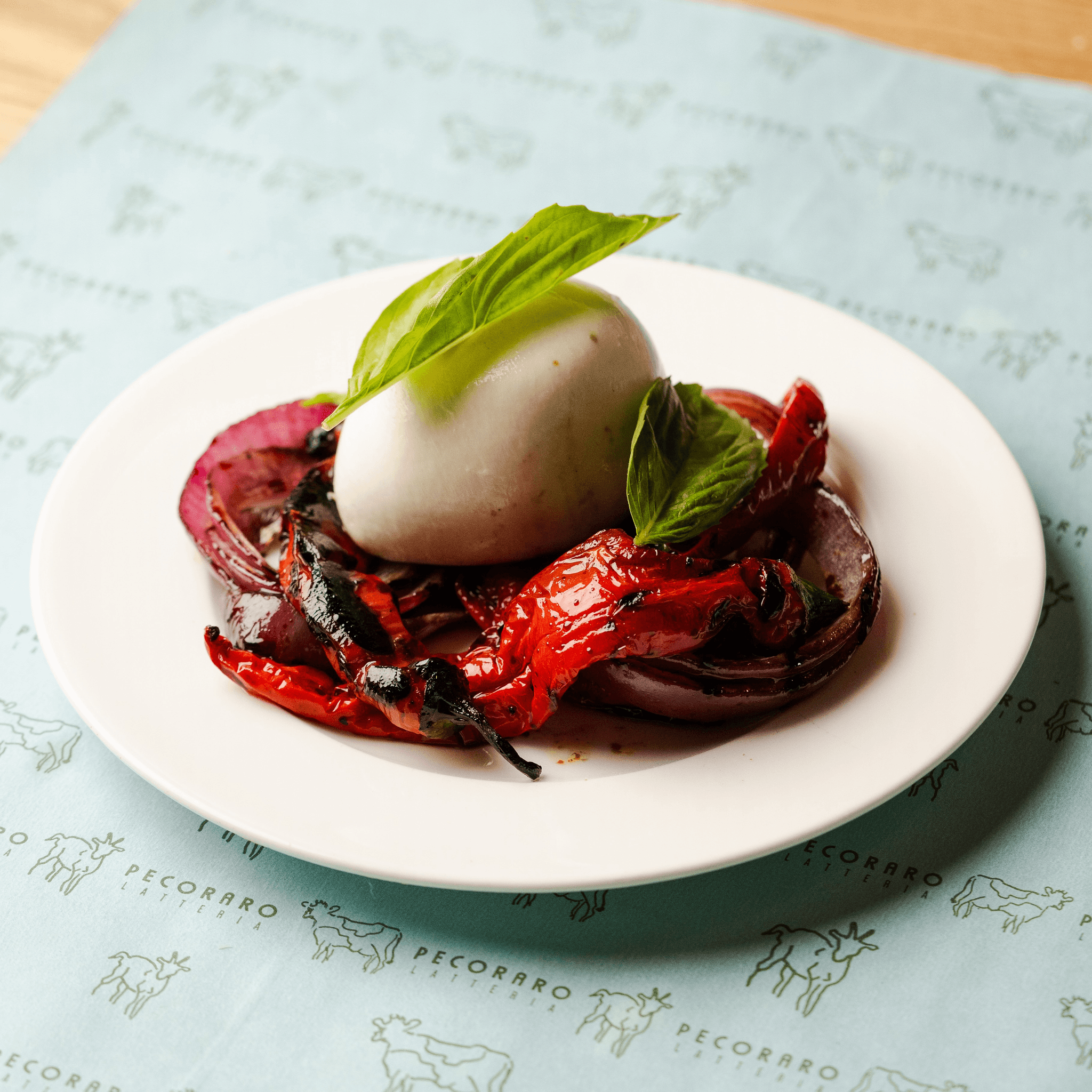 eggplant caponata, Pecoraro mozzarella, evoo.