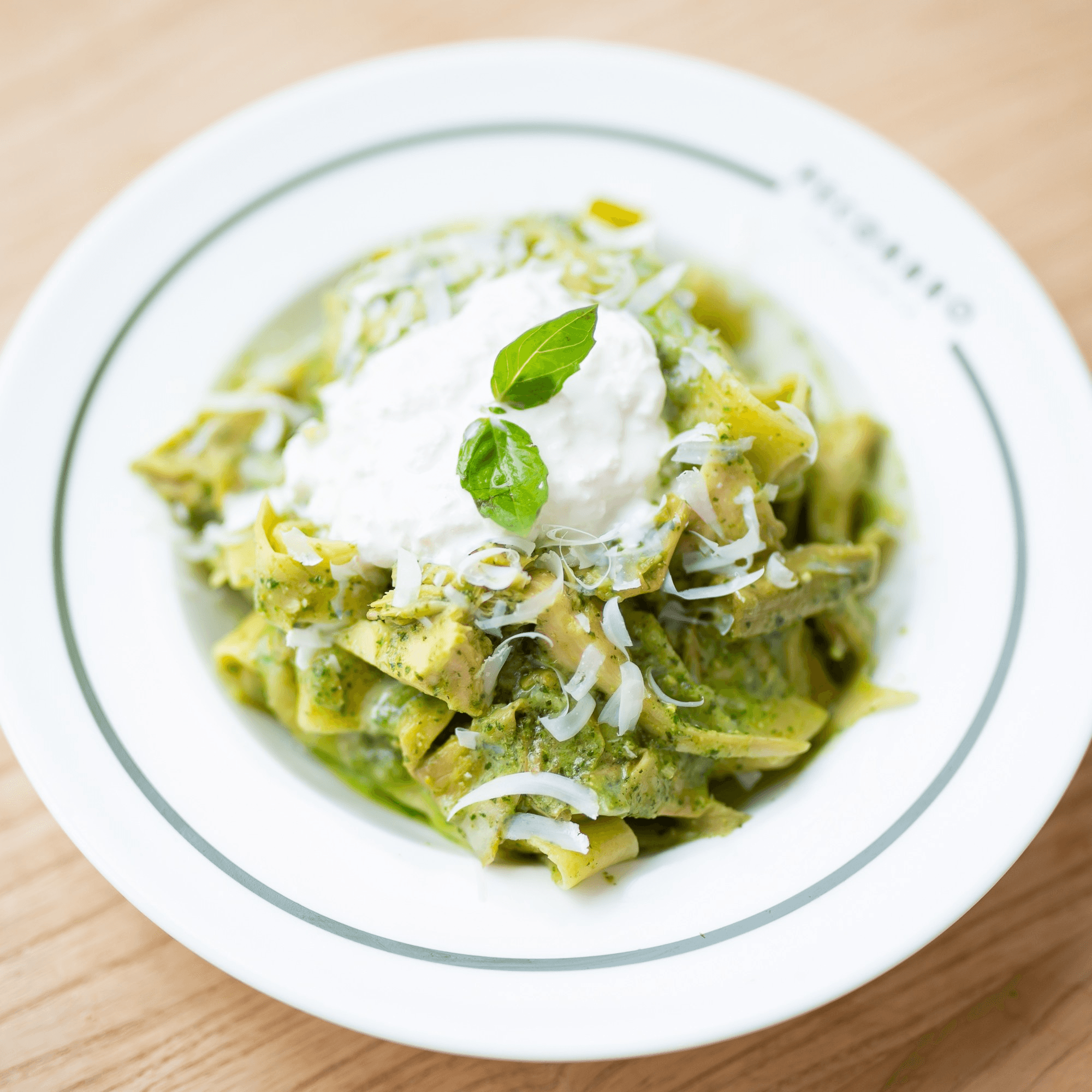 Pistachio pesto, artichoke, peas, fava beans, straccatella, pine nuts