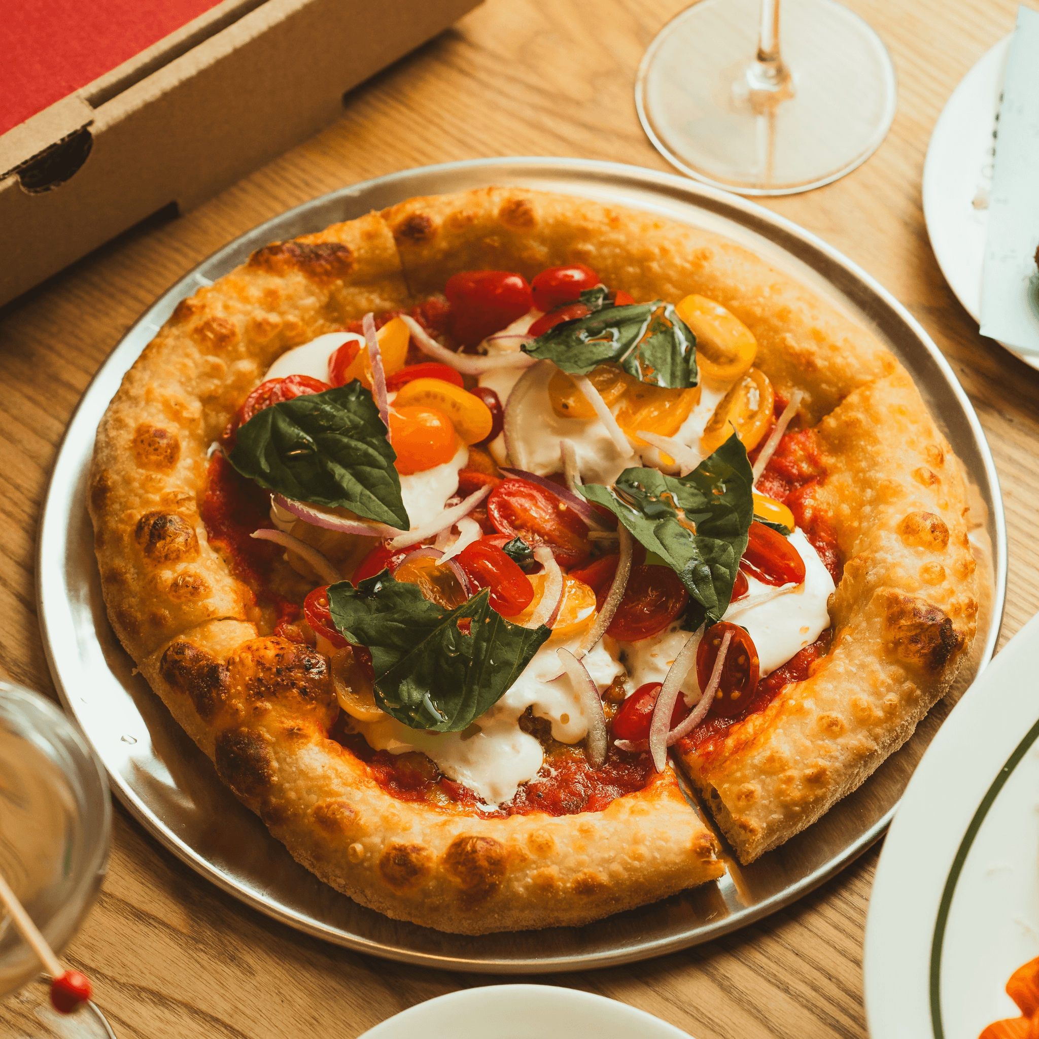 (red pie) organic tomato, Pecoraro mozzarella, basil XVO