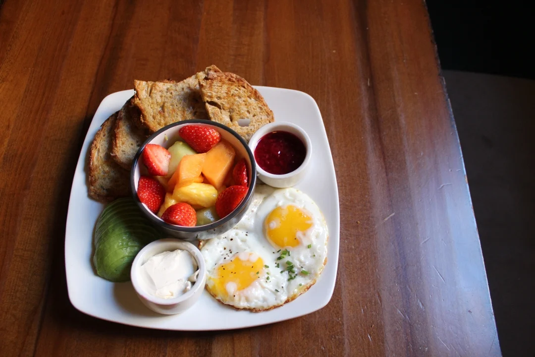 2 eggs any style, avocado, fresh fruit, multigrain toast with a side of berry compote and butter.