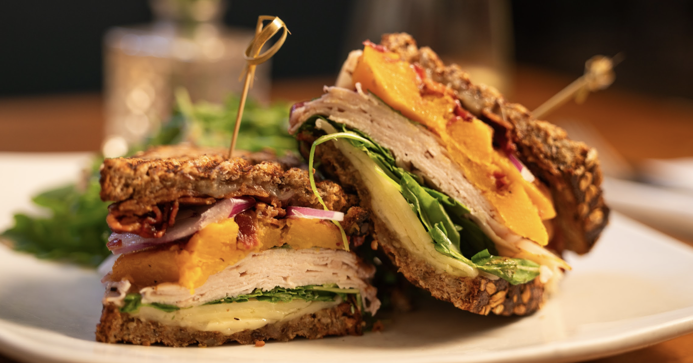 roasted squash, arugula, berry compote, red onion, bacon, dill-caper aioli. Served on Multigrain