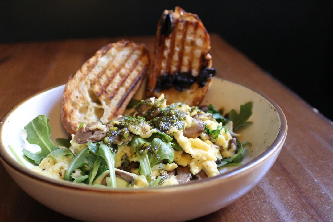 Scrambled eggs, mushrooms, chives, salsa verde, arugula. served with Caputo's olive bread