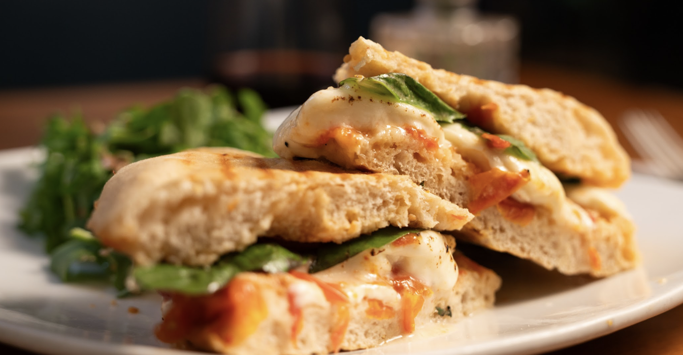 fresh burrata, roasted, tomatoes, basil, tomato jam pressed on Caputo's ciabatta bread