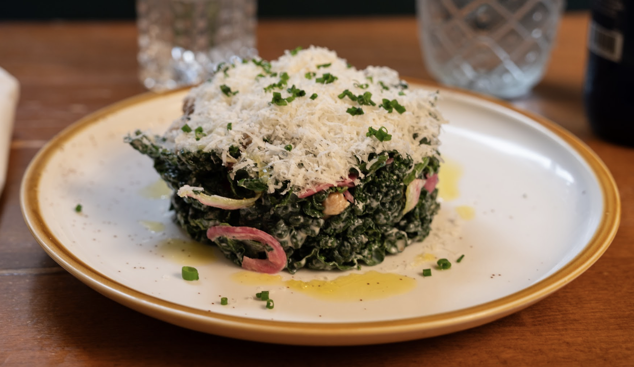 crispy chickpeas, pickled onions rainbow radish, aged parmesan, lemon tahini vinaigrette.