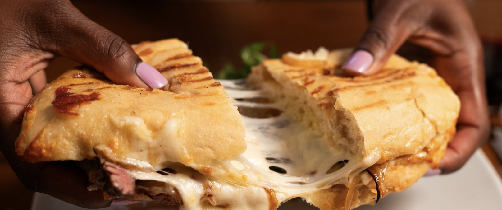 skirt steak, provolone, swiss, caramelized onions, chimichurri pressed on ciabatta