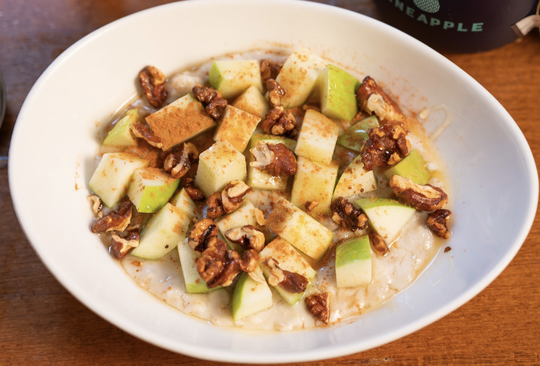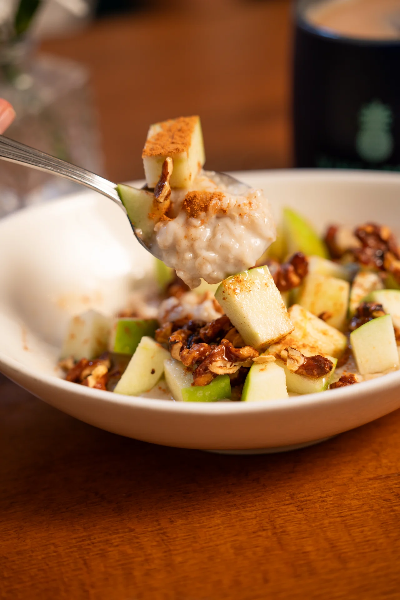 almond milk, apples, caramelized walnuts, cinnamon, honey