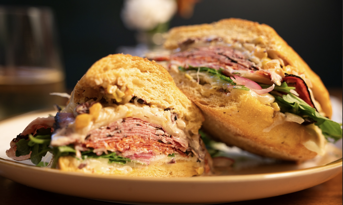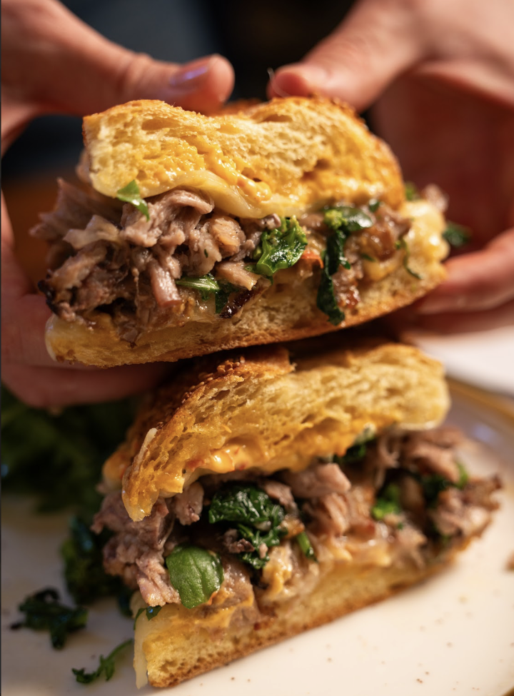 porchetta inspired carnitas, provolone, garlic broccoli rabe, Calabrian chili aioli served on Caputo's seeded semolina