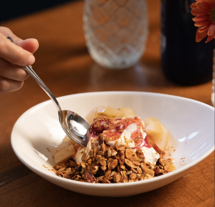 greek yogurt, poached pear, berry compote, cinnamon honey, maple granola
