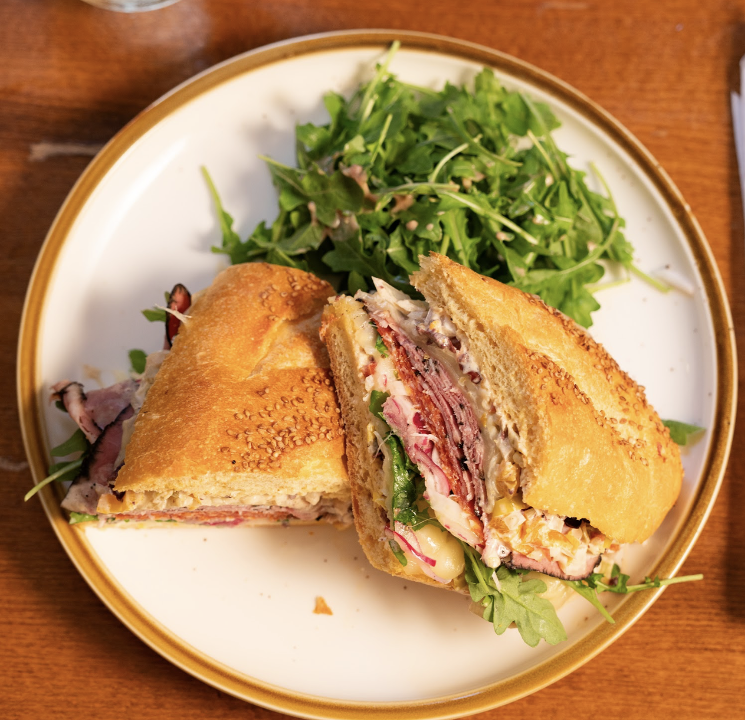 pastrami, salami picante, pickled fennel slaw, provolone, swiss, olive tapenade, cherry pepper schmear on toasted seeded semolina