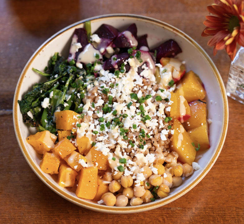 farro, roasted seasonal vegetables, feta, iso vinagrette