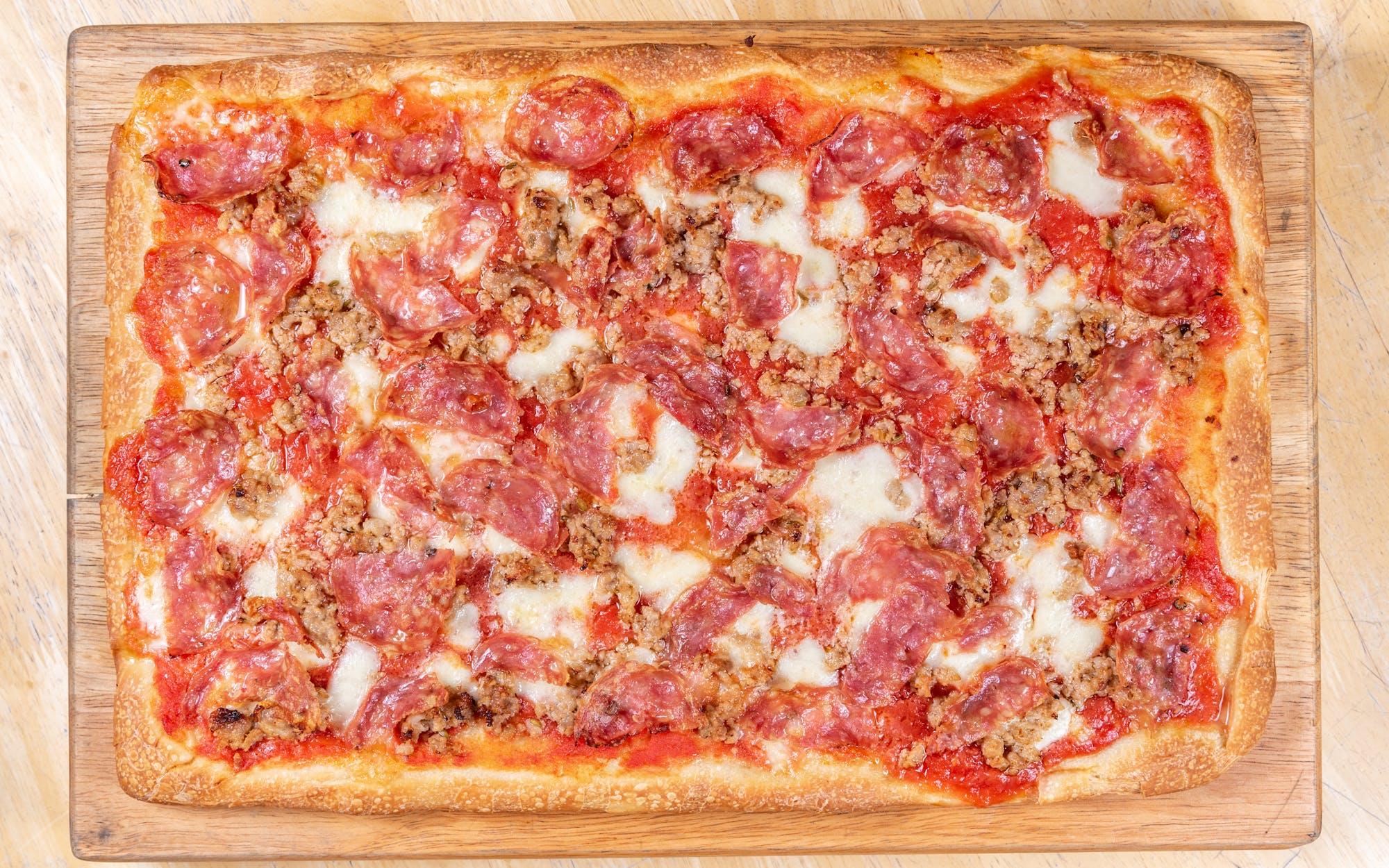 Classic Roman round pie topped with tomato sauce, mozzarella fior di latte and Italian sausage