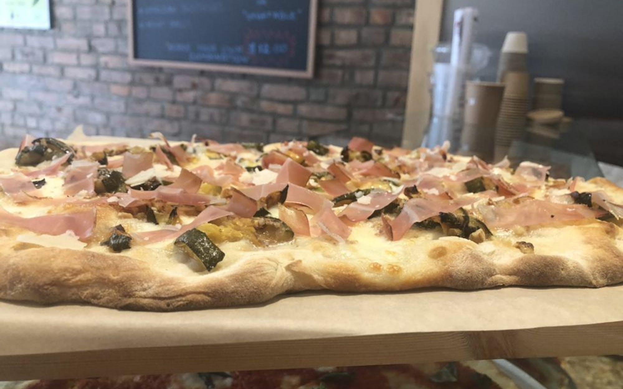 Classic Roman pie topped with mozzarella di bufala, cherry tomatoes and fresh basil