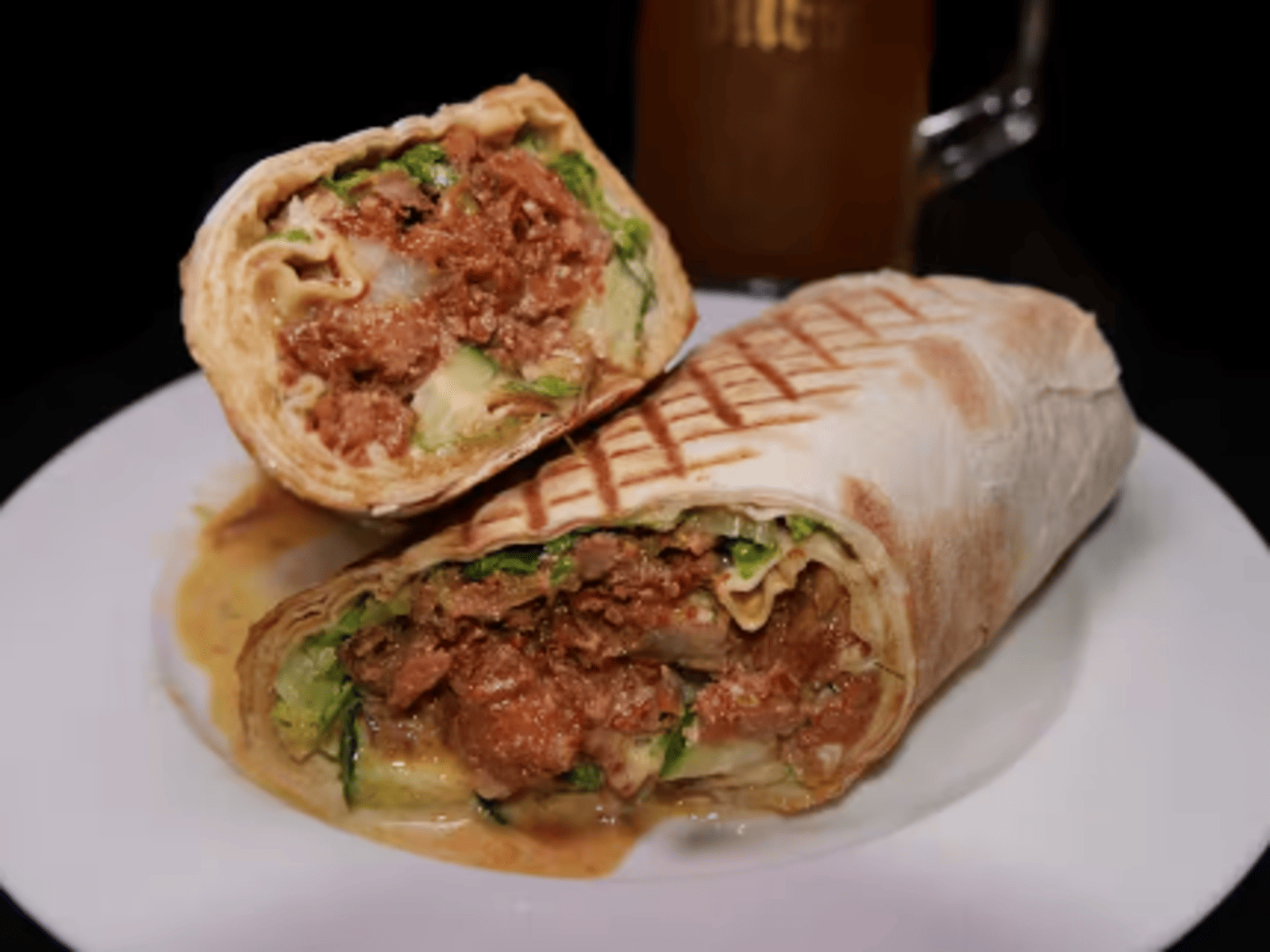 A blend of chicken and pork with veggies and sauces, all wrapped up in a soft flatbread.