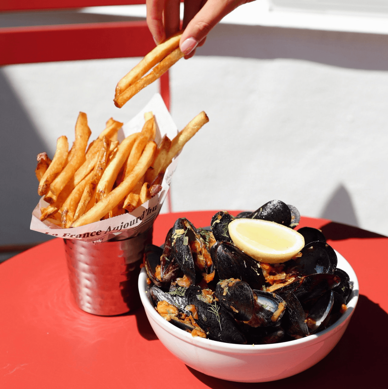 Saffron white wine sauce, tomato concassé, and served with fries.
