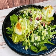 Poached eggs, guacamole, radish, goat cheese, sauce au vert, sourdough toast, and salad.