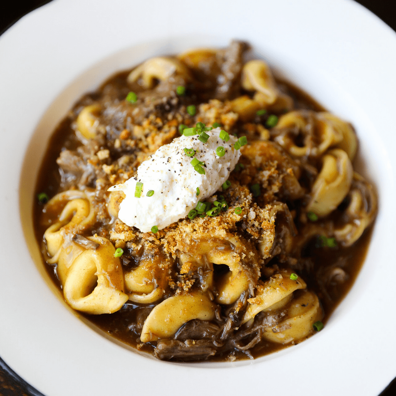 Braised beef with cheese tortellini, topped with ricotta cheese and panko.