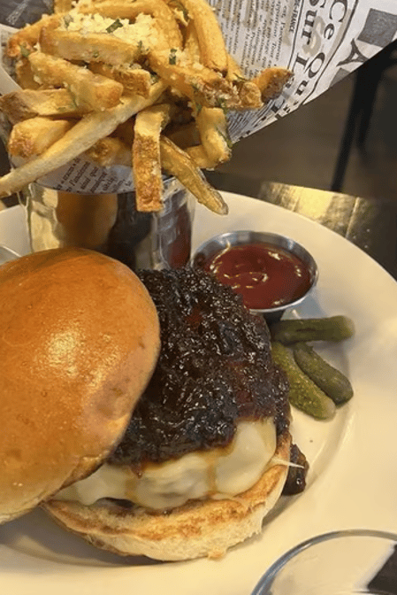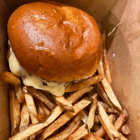 Angus beef with Gruyère, served with fries.