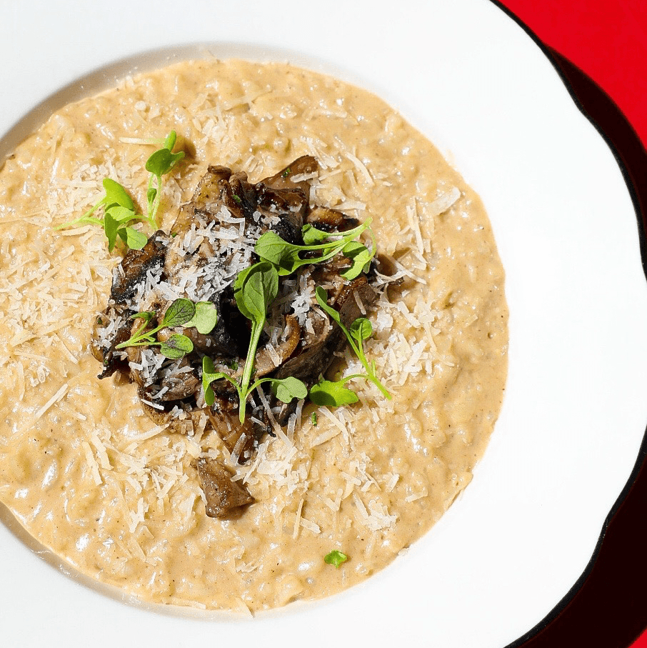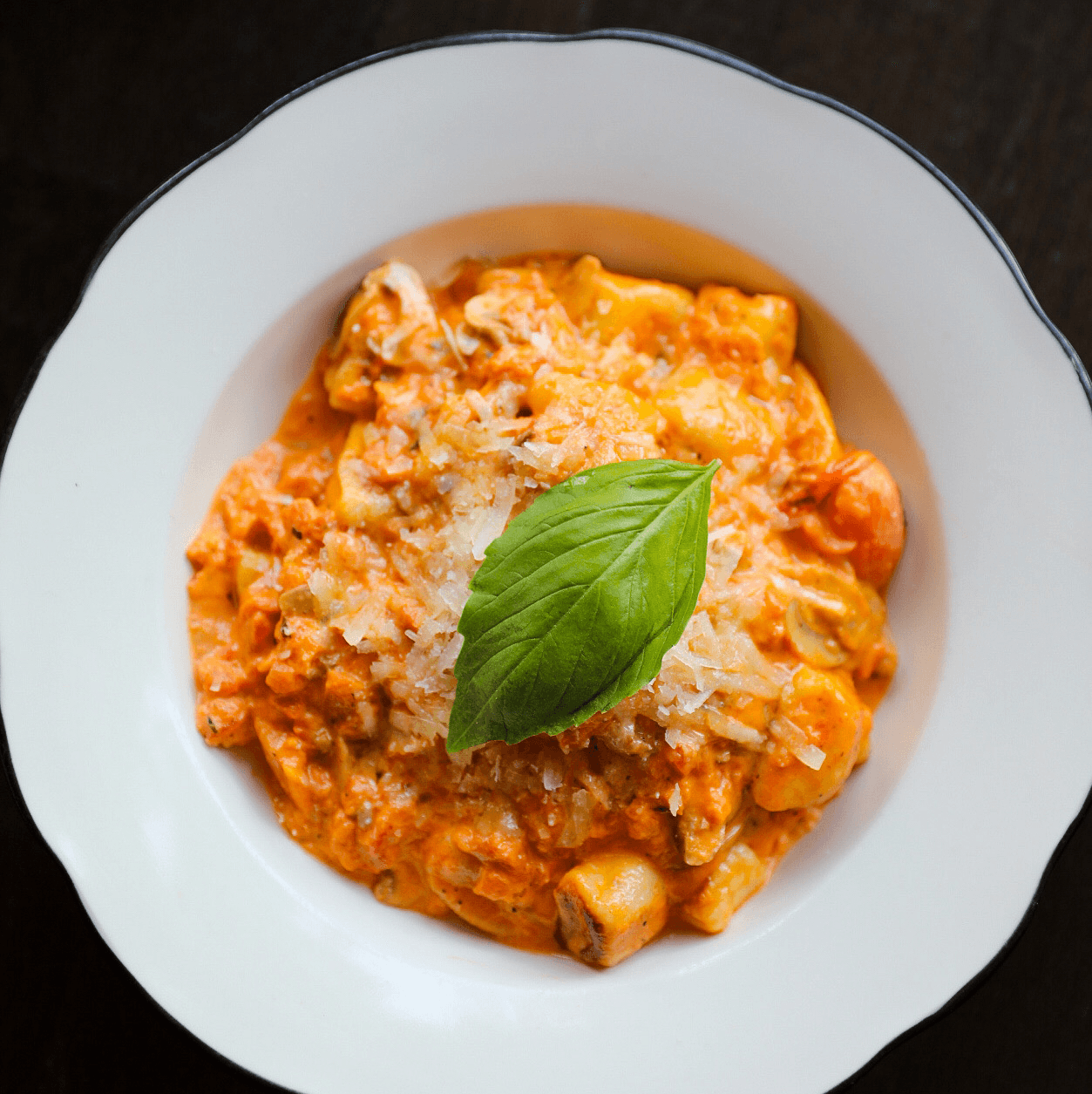 Hand-rolled potato gnocchi in a rich tomato and butter sauce, with sautéed mushrooms, finished with basil and aged Parmigiano.