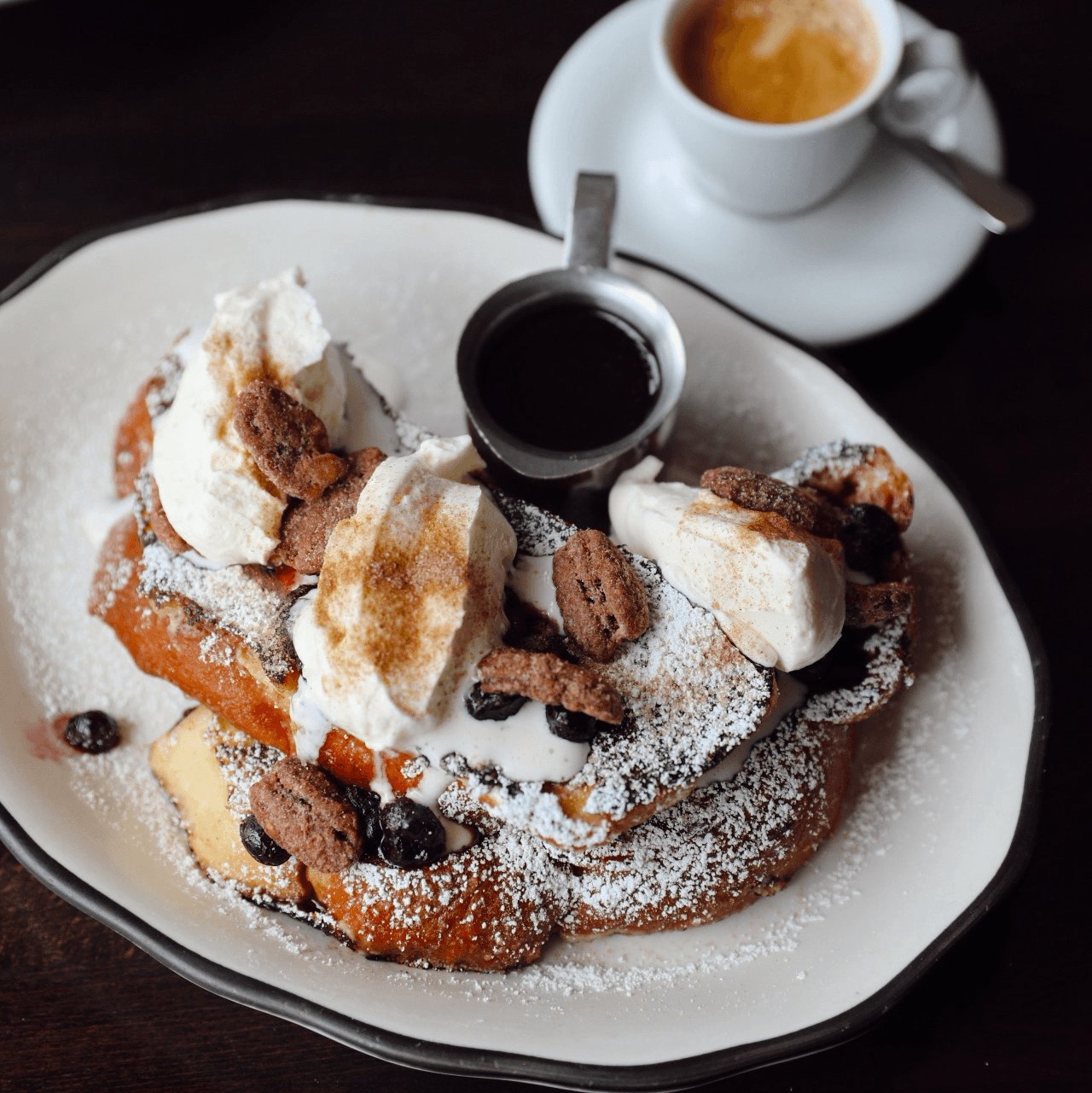 Challah loaf, blueberry compote, vanilla cream, cinnamon sugar, candied pecans, and miso syrup