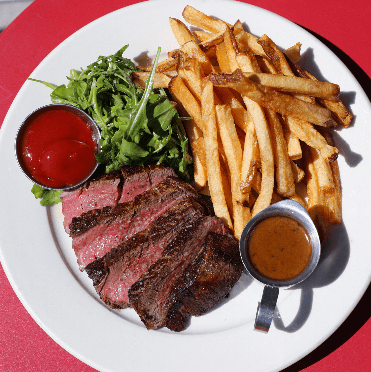 8 oz bavette with sauce au poivre, served with fries.
