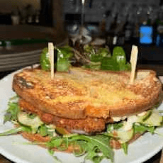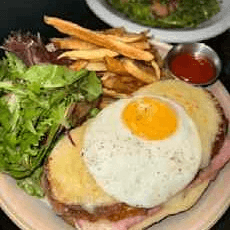 Sunny side egg, jambon de Paris, gruyere, Swiss cheese, sauce bechamel, and served with fries or salad.