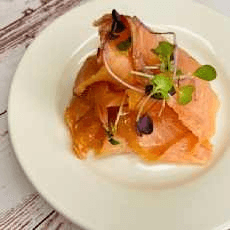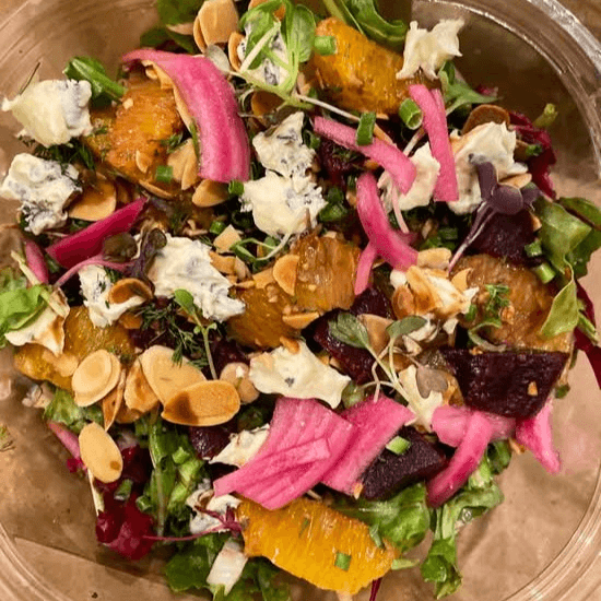 Arugula, romaine, radicchio, mixed beets, orange, pickled onions, Gorgonzola cheese, almonds, and balsamic vinaigrette.