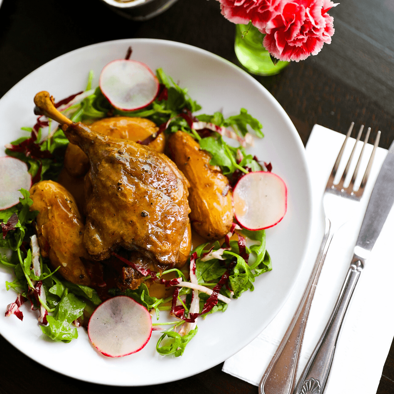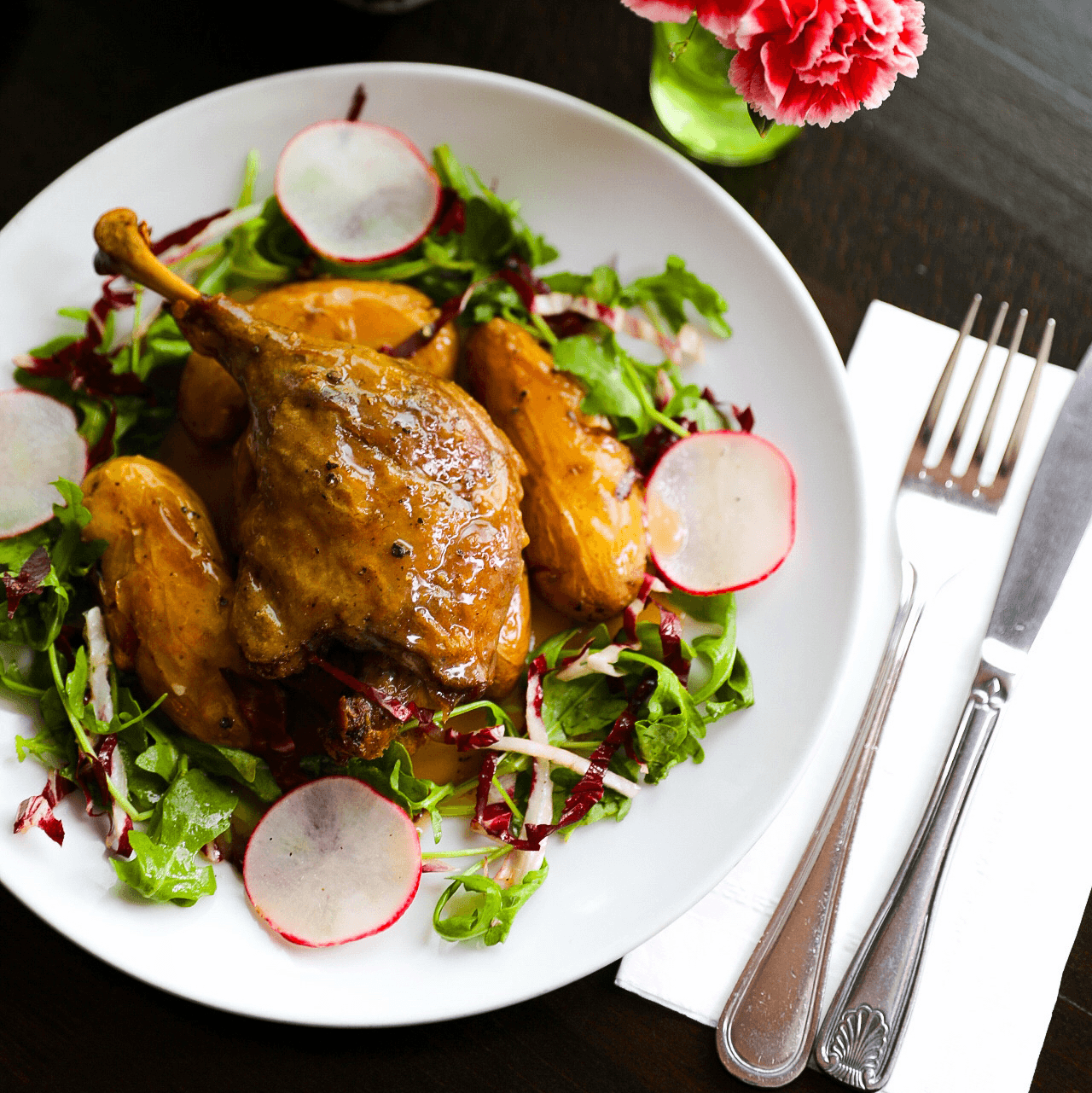 Slow-cooked in duck fat, served with crispy potatoes and duck jus.
