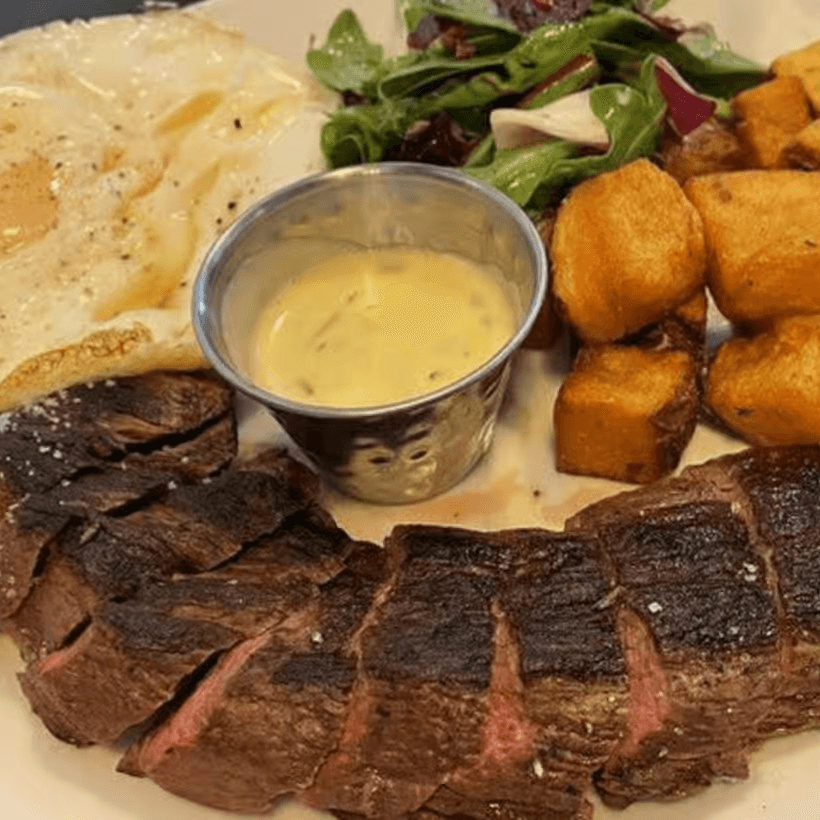 6 oz striploin, two eggs, served with home fries, salad, and sauce béarnaise.