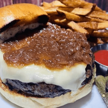 Angus beef with Gruyère cheese, mustard aioli, and onion jam, served with fries.