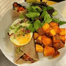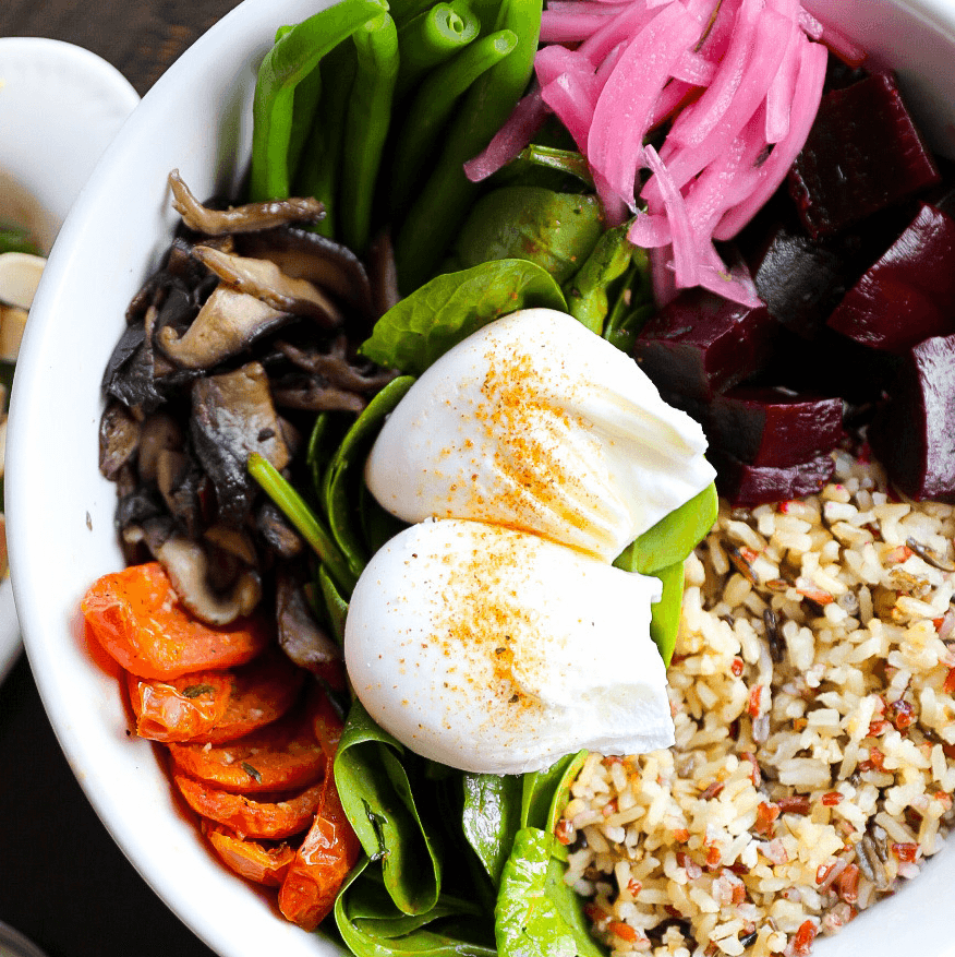 Wild rice, poached eggs, baby spinach, pickled onions, sautéed mushrooms, miso-confit tomato, roasted beets, green beans, and French dressing.