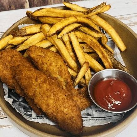 Breaded and fried, served with fries.