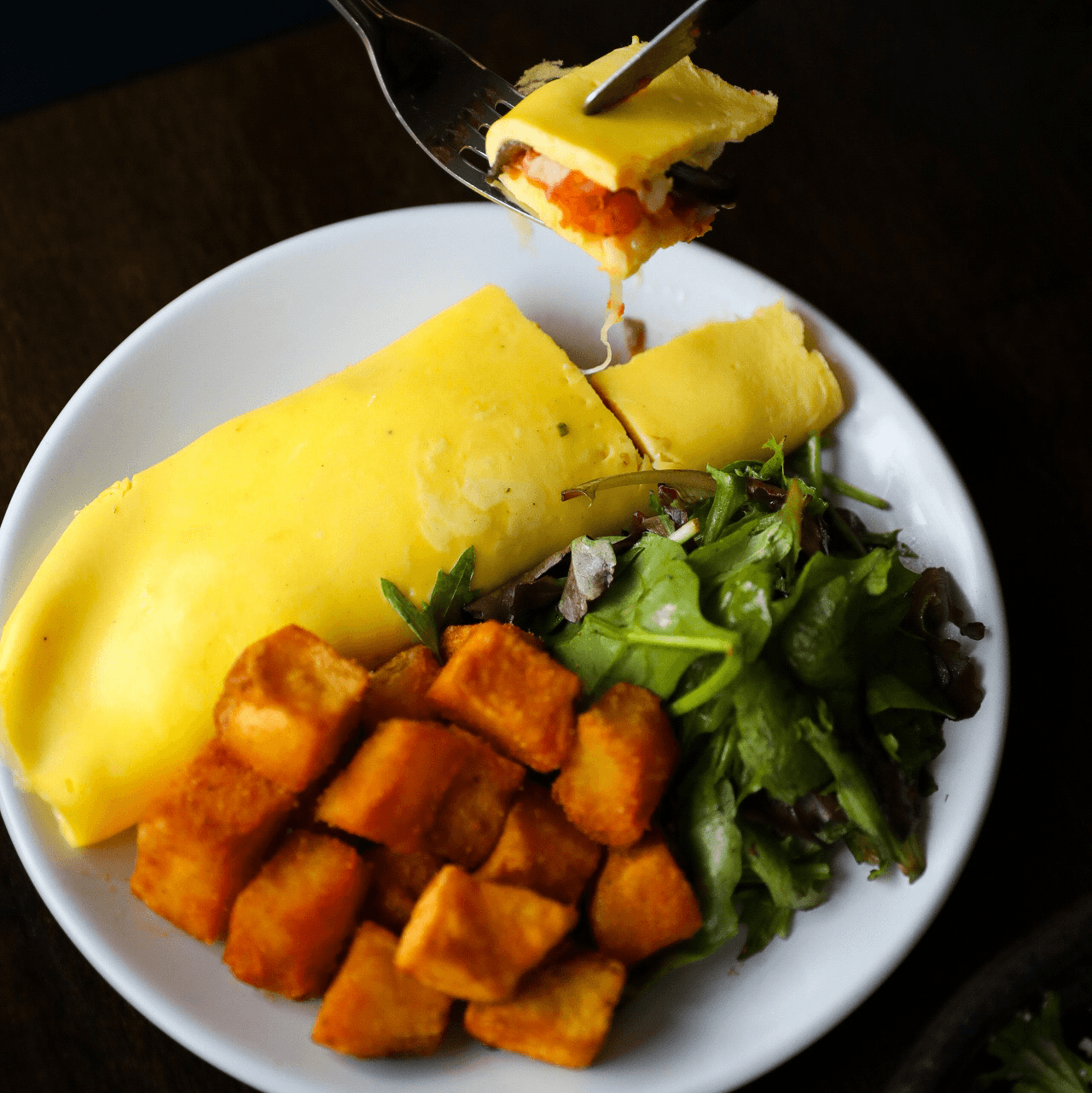Mushrooms, tomato concassé, ham, and Swiss cheese, served with home fries and salad.