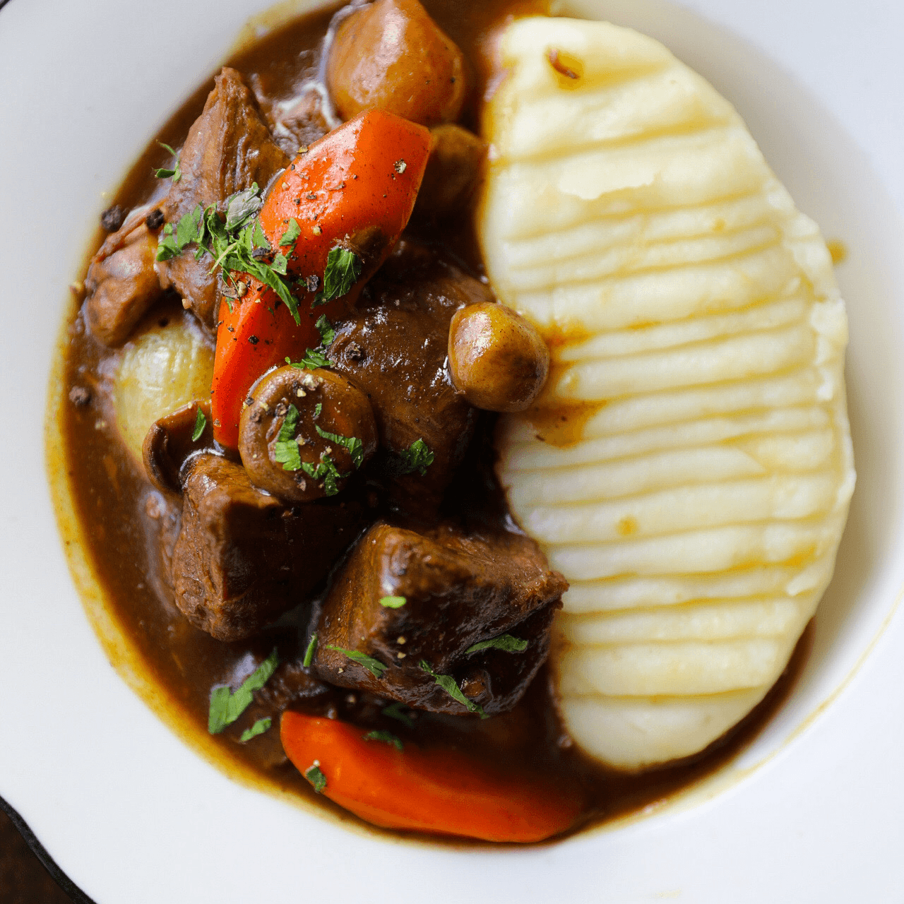 Braised beef, pomme purée (mashed potatoes), carrots, mushrooms, and pearl onions.