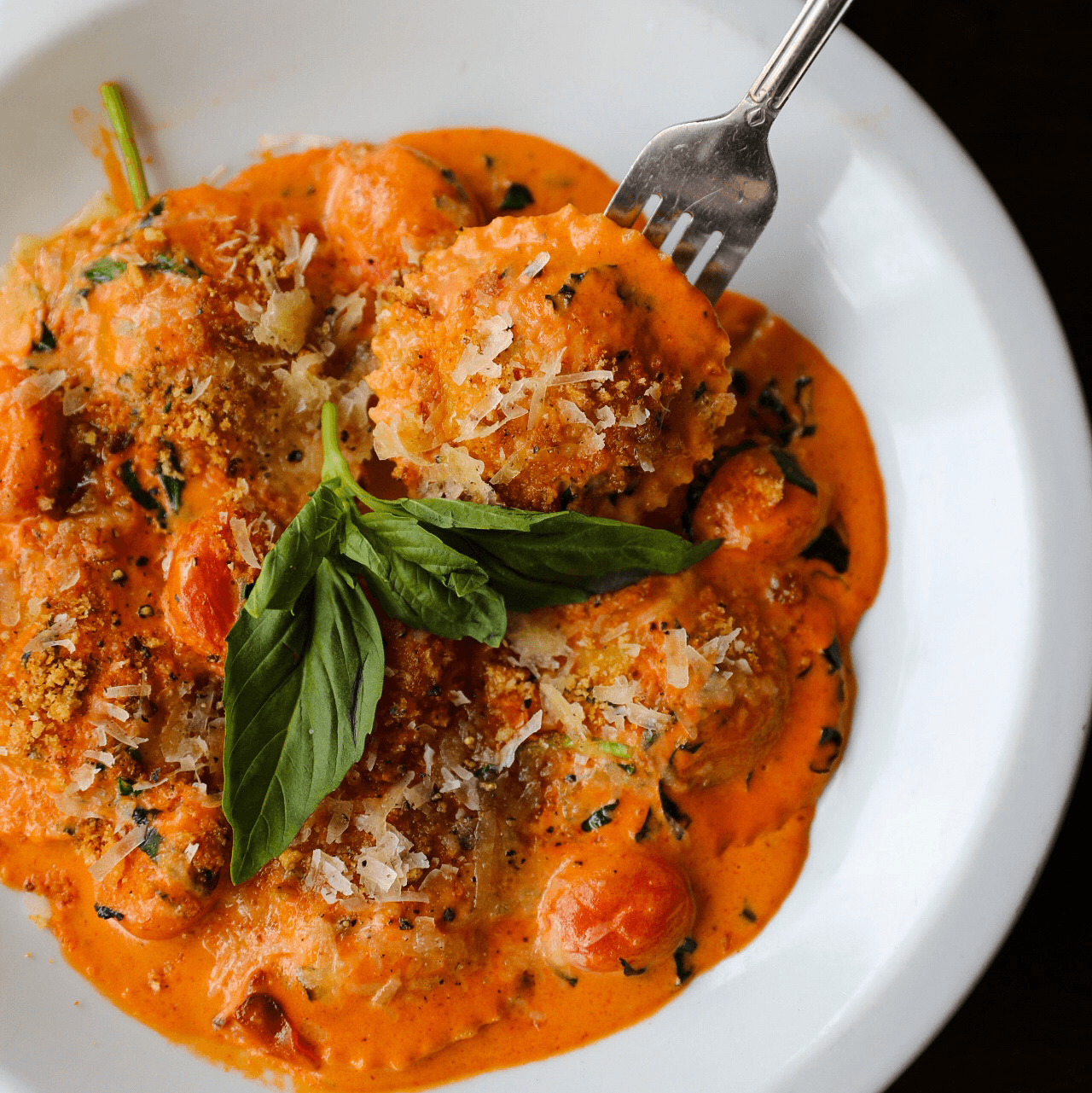Homemade ravioli filled with three cheeses and spinach, served with tomato-basil sauce, panko, and Pecorino.