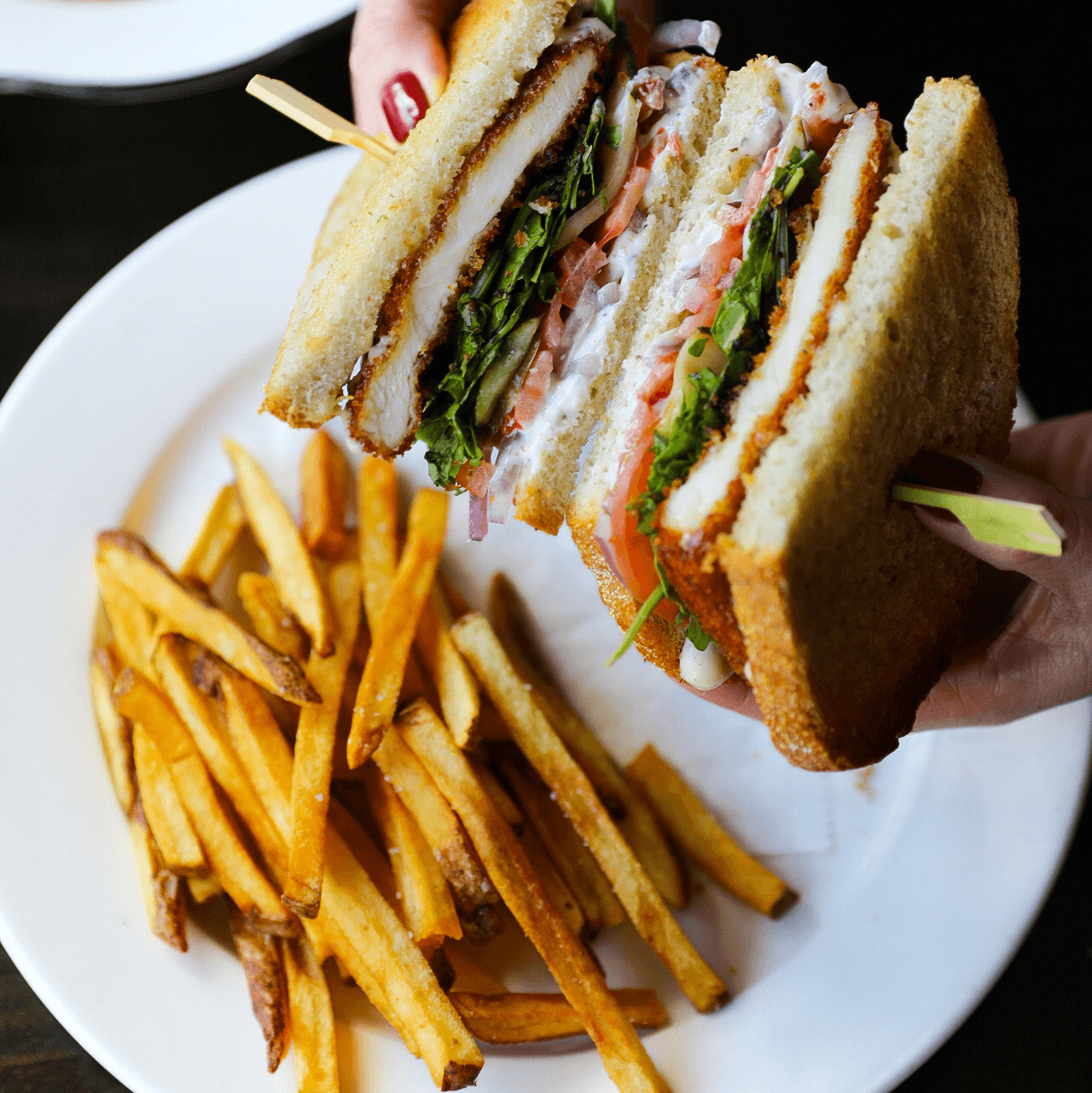 Fried chicken, garlic aioli, arugula, pickled cucumbers, onions, balsamic glaze, on sourdough. Choice of fries or salad