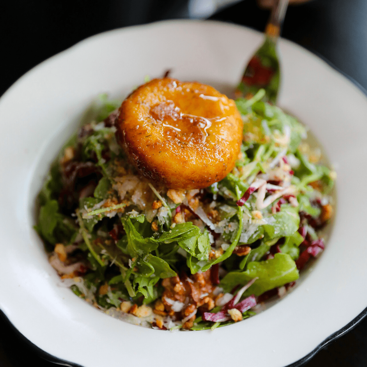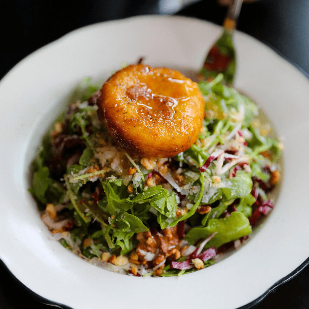 Warm goat cheese, radicchio, arugula, apples, walnuts, honey Dijon dressing