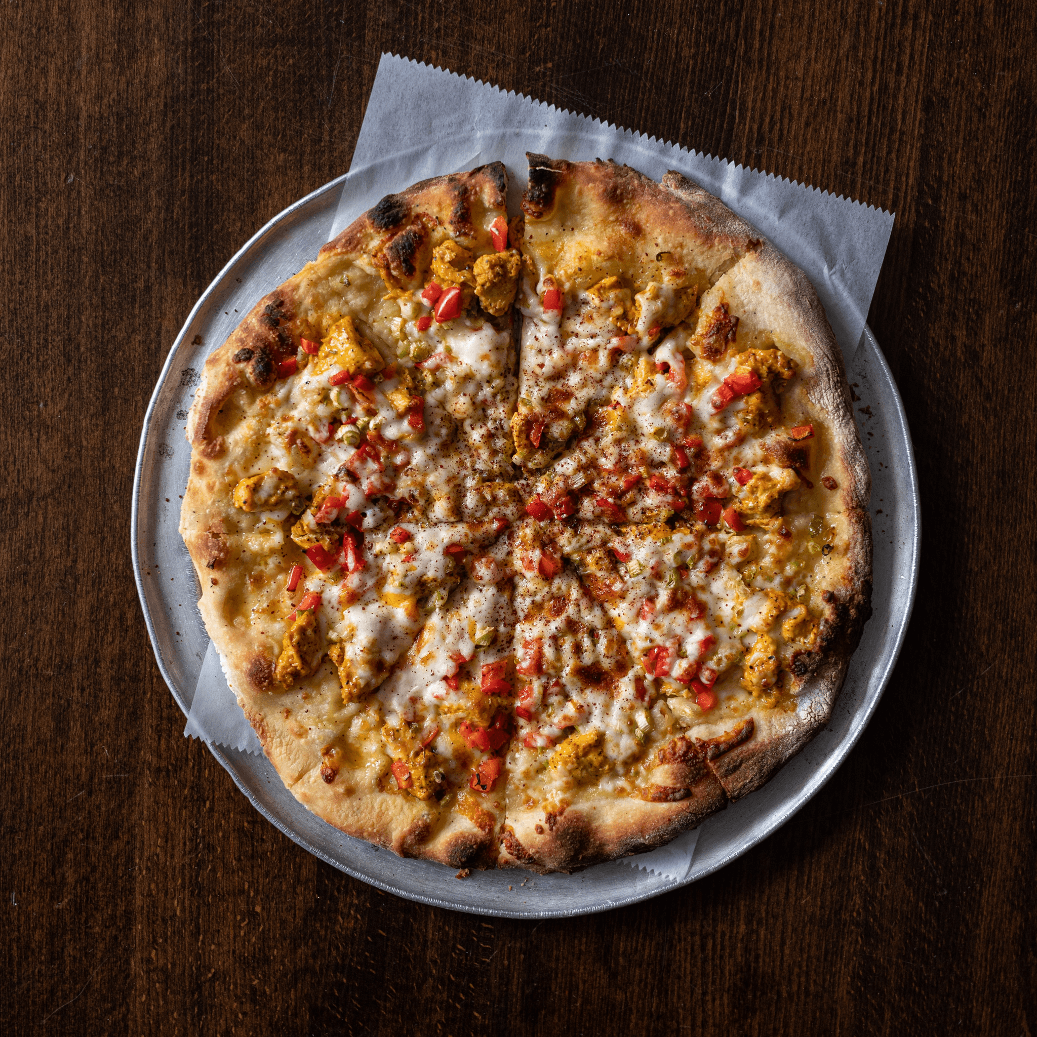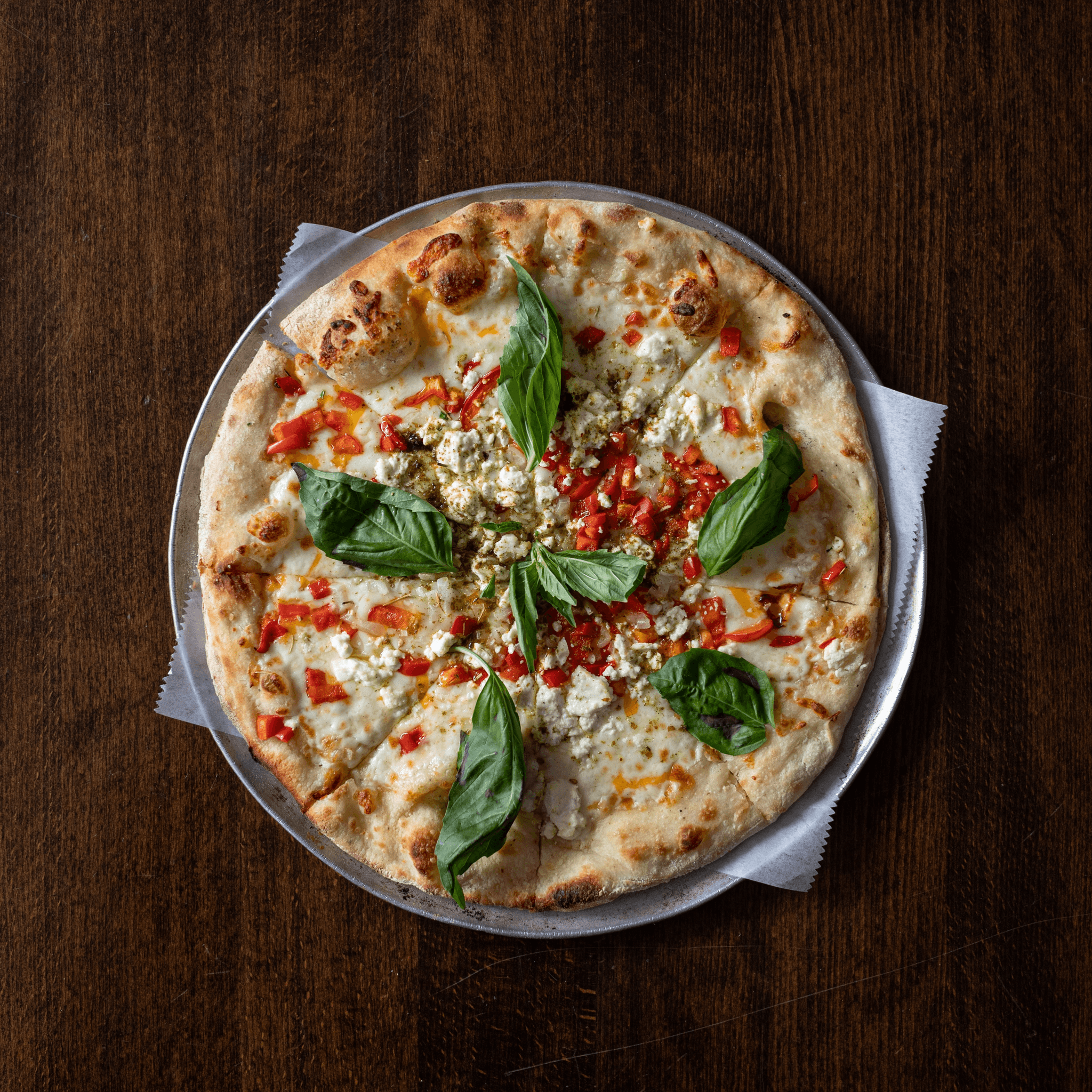 Goat cheese, mozzarella cheese, diced red peppers, and chopped onions, topped with fresh basil & a dash of zaatar