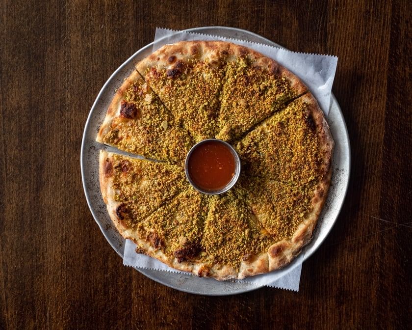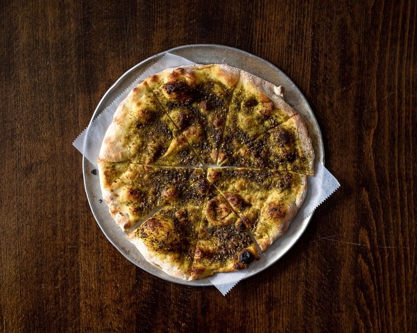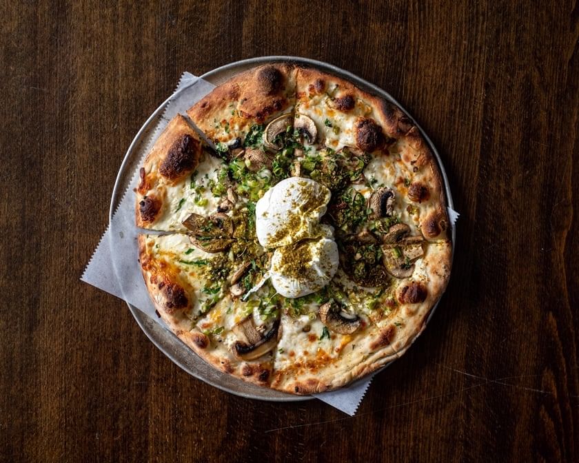 Grilled onion, mushrooms, parsley, scallion, mozzarella, feta, Zaatar, and two poached eggs