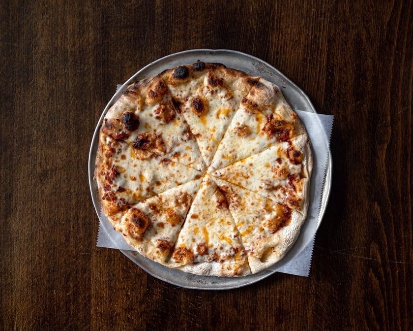 Monterey Jack, cheddar, mozzarella, asadero, romano, and Parmigiano cheeses over marinara sauce