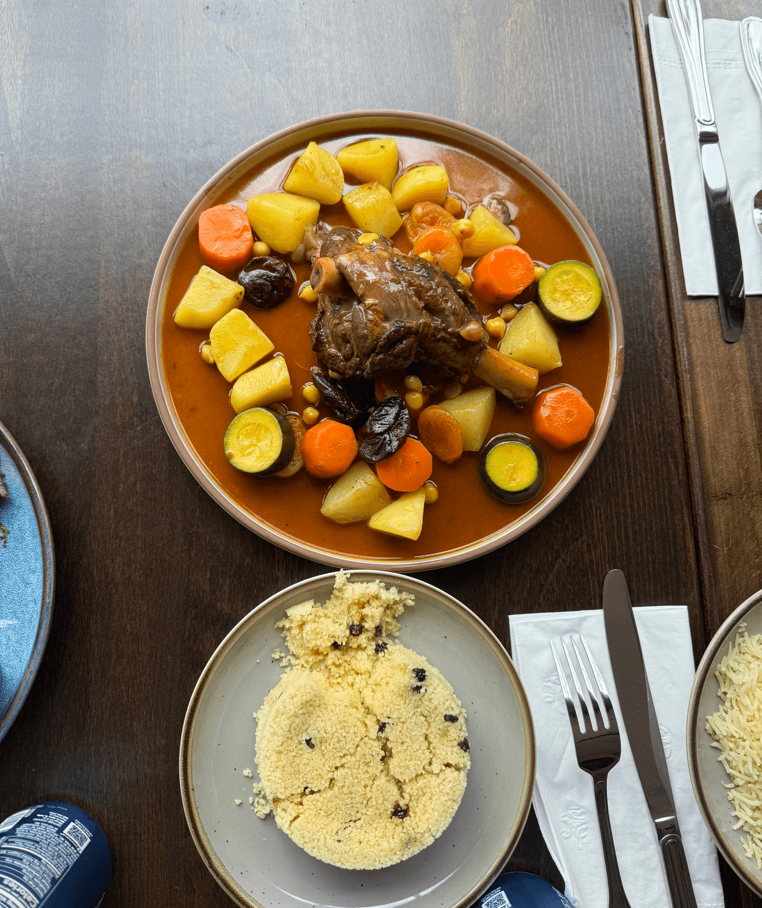 Slow cooked tender shank with vegetables, chickpeas, prunes, potatoes apricots and choice of raisin couscous or rice