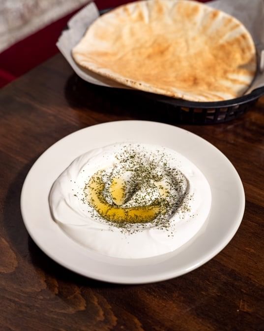 Homemade yogurt spread with olive oil and mint. Served with fresh pita bread