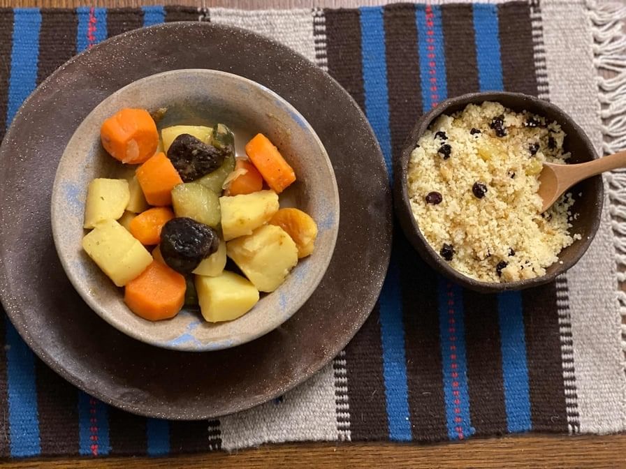 Carrots, zucchini, turnips, potatoes, and apricots. Served with raisin couscous or rice
