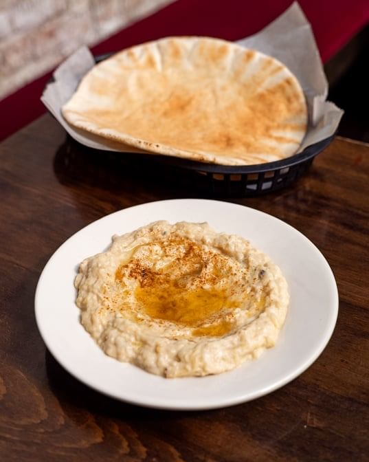 Grilled eggplant blended with tahini, garlic, and olive oil. Served with fresh pita bread