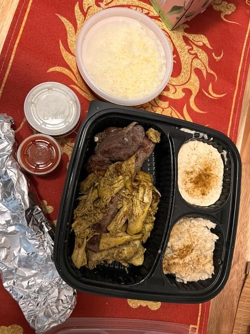 Shredded and spiced rotisserie chicken. Served with pita, rice, hummus, and baba ghanoush